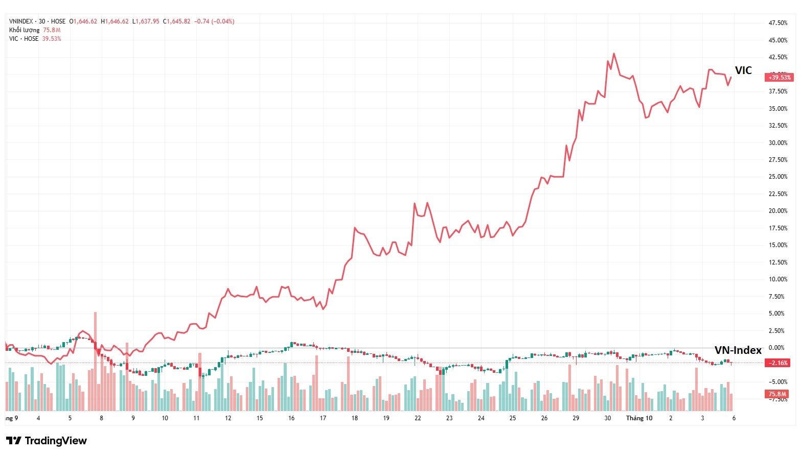 Đóng cửa phiên giao dịch 3/10, cổ phiếu VIC dừng ở mức 176.500 đồng/cổ phiếu, mức đắt đỏ nhất kể từ khi niêm yết. Chỉ trong 1 tháng, thị giá VIC đã tăng hơn 43%, đóng góp tới 49 điểm tích cực cho VN-Index, bỏ xa mã đứng sau là LPB (5,6 điểm).