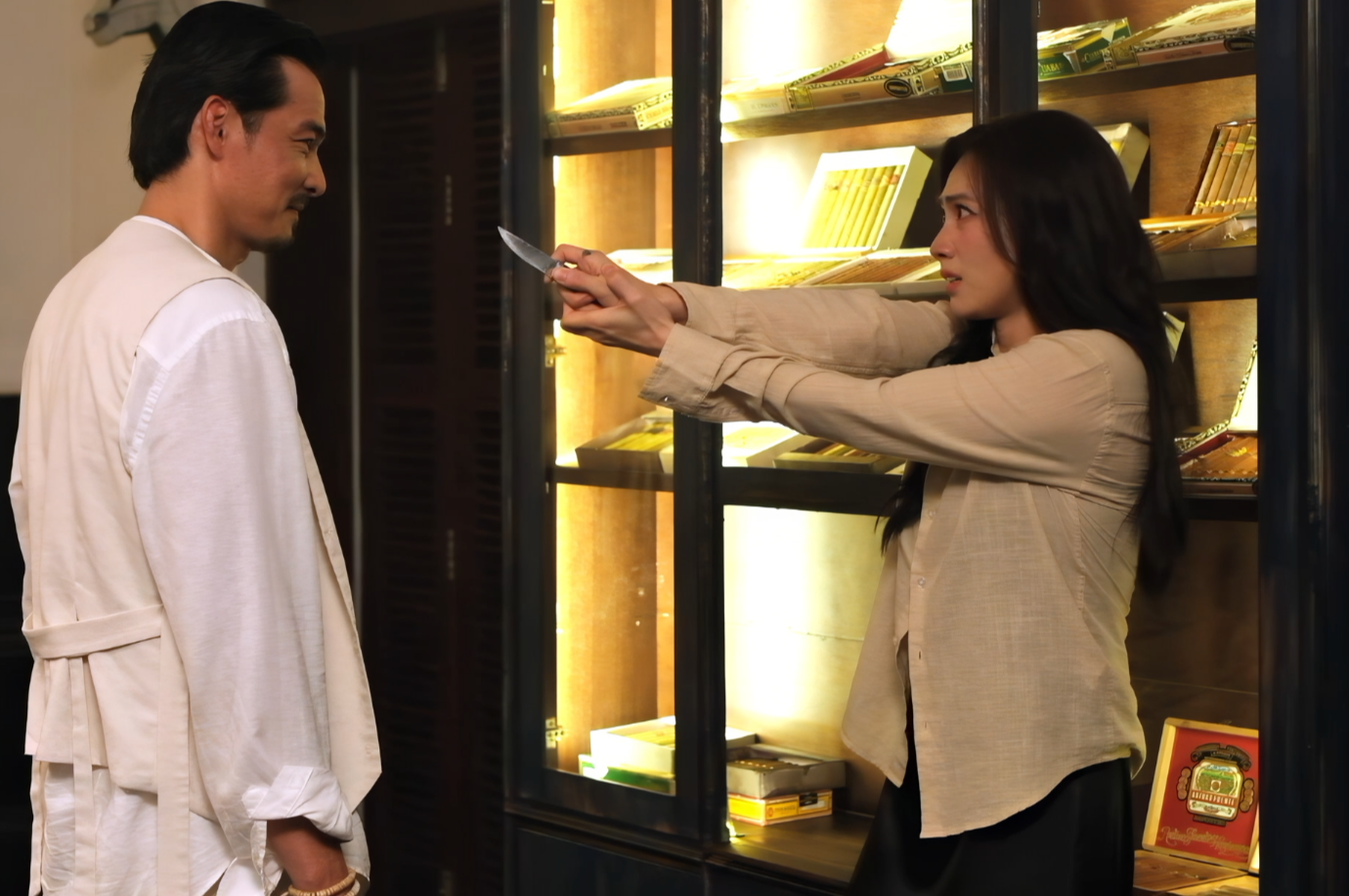Một chi tiết khiến khán giả đặc biệt chú ý là việc ê kíp quyết định sử dụng đạo cụ gần với thực tế nhất có thể. Trong phân cảnh cao trào, Phương Anh Đào phải cầm một con dao thật. Sự lo lắng hiện rõ trên gương mặt cô, trong khi Quách Ngọc Ngoan cũng không giấu được cảm giác sợ hãi khi lưỡi dao tiến sát mình. Chính phản ứng tự nhiên này lại trở thành yếu tố giúp cảnh quay đạt được độ chân thực cần thiết, phù hợp với tinh thần chung của bộ phim.