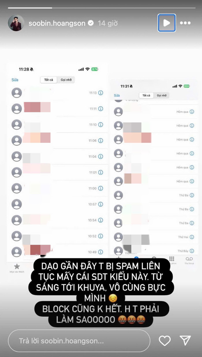 Mới đây, Soobin Hoàng Sơn bất ngờ chia sẻ tình huống khó chịu trên trang cá nhân khi liên tục bị các số điện thoại lạ làm phiền. Nam ca sĩ công khai lịch sử cuộc gọi với hàng loạt cuộc gọi nhỡ từ nhiều số khác nhau và bức xúc viết: “Dạo gần đây tôi bị làm phiền liên tục mấy số điện thoại kiểu này. Từ sáng tới khuya, vô cùng bực mình. Chặn cũng không hết, giờ tôi phải làm sao”.