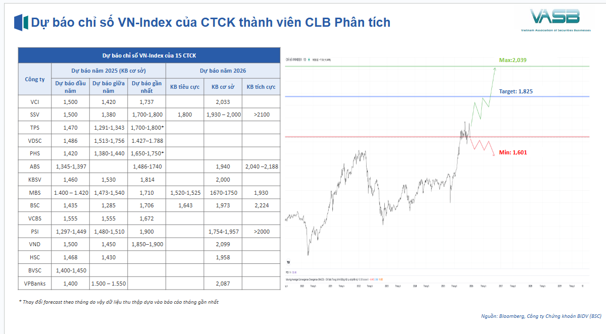 Trên cơ sở các yếu tố vĩ mô hiện tại, BSC đưa ra kịch bản dự báo cơ sở cho năm 2026 với mục tiêu VN-Index ở vùng 1.285 điểm, phản ánh quan điểm thận trọng hơn khi các rủi ro vĩ mô gia tăng và tăng trưởng EPS được điều chỉnh về mức thực tế hơn, khoảng 7–8%.