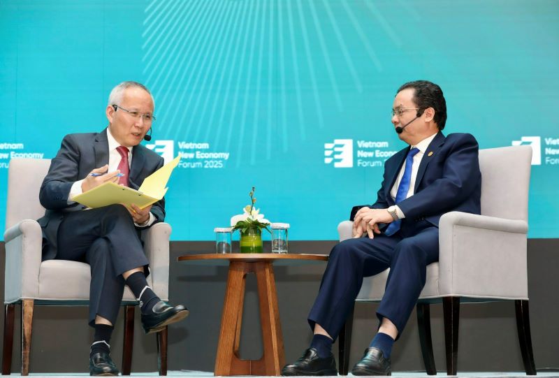 GS.TS Hoàng Văn Cường và ông Trần Quốc Khánh trao đổi tại Diễn đàn Kinh tế mới Việt Nam 2025.