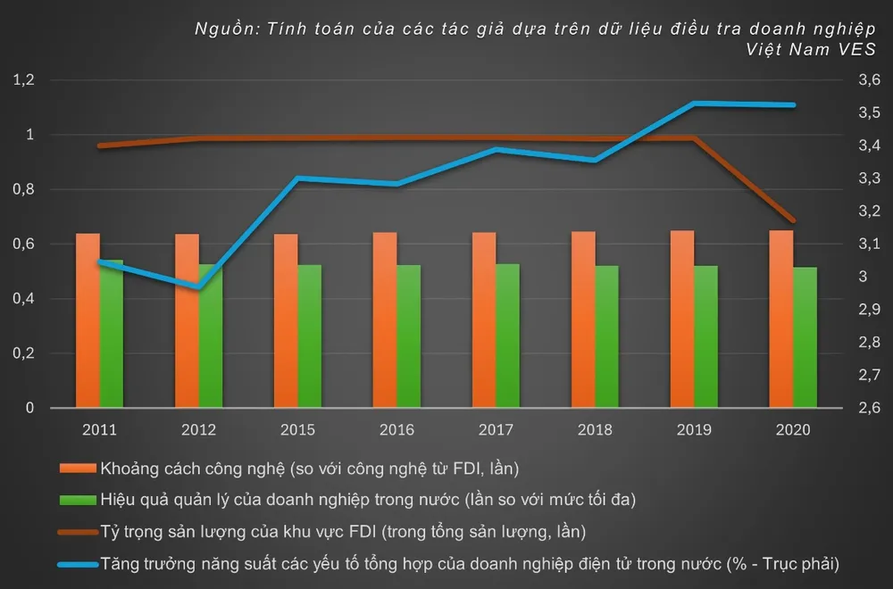 Trung bình, doanh nghiệp nội chỉ hoạt động ở mức khoảng 64% so với "đường biên công nghệ" mà doanh nghiệp FDI tạo ra và khoảng cách này gần như không thu hẹp từ năm 2011 đến 2020.