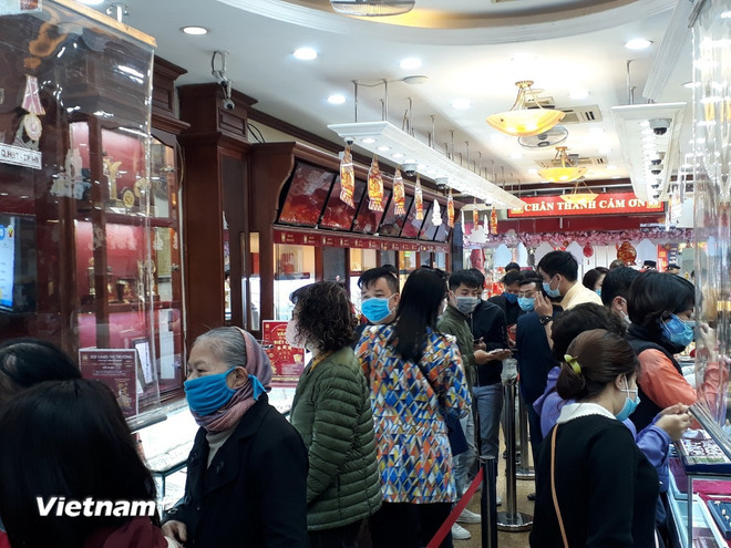 Nhiều người dân tranh thủ mua khi giá vàng giảm. (Ảnh: Vietnam+)