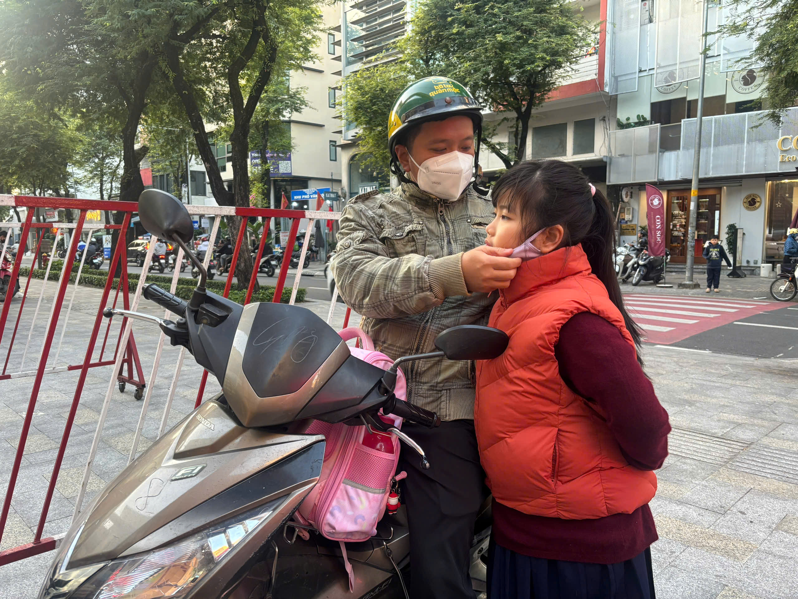 Nhiệt độ giảm sâu, trẻ nhỏ được phụ huynh trang bị áo khoác dày khi đến trường sáng nay.
