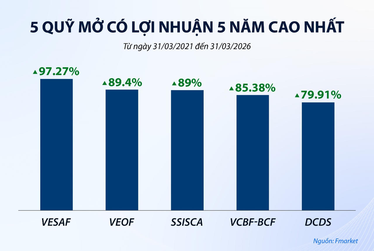 Dữ liệu từ Fmarket - nền tảng tập trung quỹ mở lớn nhất Việt Nam cho thấy, tính đến hết tháng 3/2026, quỹ VESAF đang dẫn đầu các quỹ có lợi nhuận 5 năm cao nhất với hiệu suất bình quân đạt 14,5%/năm.