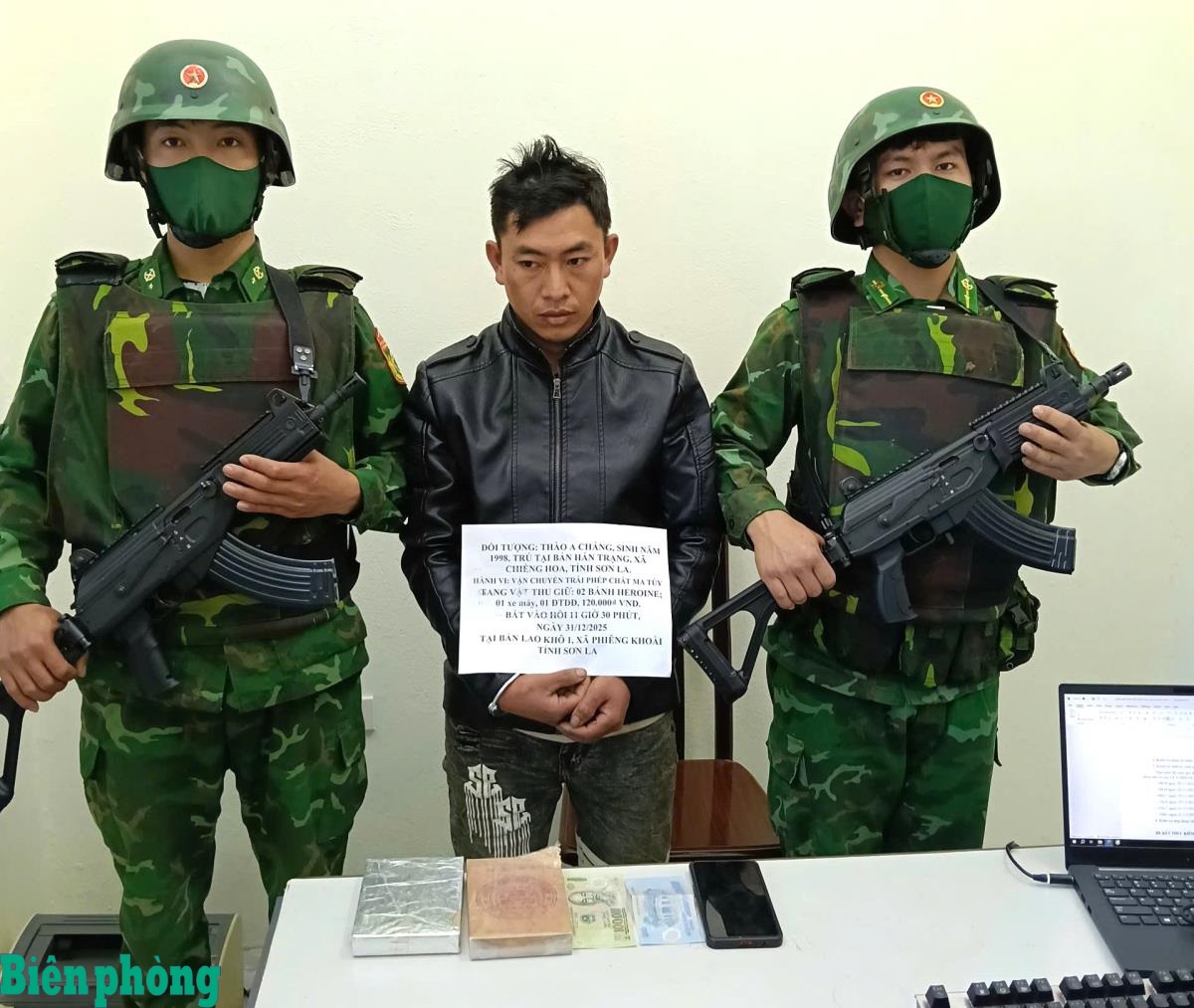 Lúc 12 giờ 20 phút, ngày 31/12/2025, tại khu vực bản Lao Khô 1 (xã Phiêng Khoài, tỉnh Sơn La), thực hiện Kế hoạch đấu tranh Chuyên án SL1225, tổ công tác gồm: Đồn Biên phòng Chiềng On; Phòng Nghiệp vụ (Ban Chỉ huy Bộ đội Biên phòng tỉnh Sơn La); Đoàn Đặc nhiệm phòng, chống ma túy và tội phạm miền Bắc (Cục Phòng, chống ma túy và tội phạm Bộ đội Biên phòng); Phòng PC04, Công an xã Phiêng Khoài, Công an xã Yên Sơn (Công an tỉnh Sơn La) dừng kiểm tra hành chính Thào A Cháng (sinh năm 1998, trú tại xã Chiềng Hoa, tỉnh Sơn La), phát hiện 2 bánh bột nén màu trắng được cất giấu dưới yên xe máy. Biết không thể chối cãi, Thào A Cháng nhanh chóng khai nhận, đó là heroin.