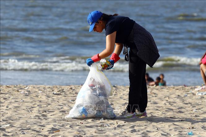 Tình nguyện viên dọn rác trên bãi biển ở Alexandria, Ai Cập. Ảnh: THX/TTXVN