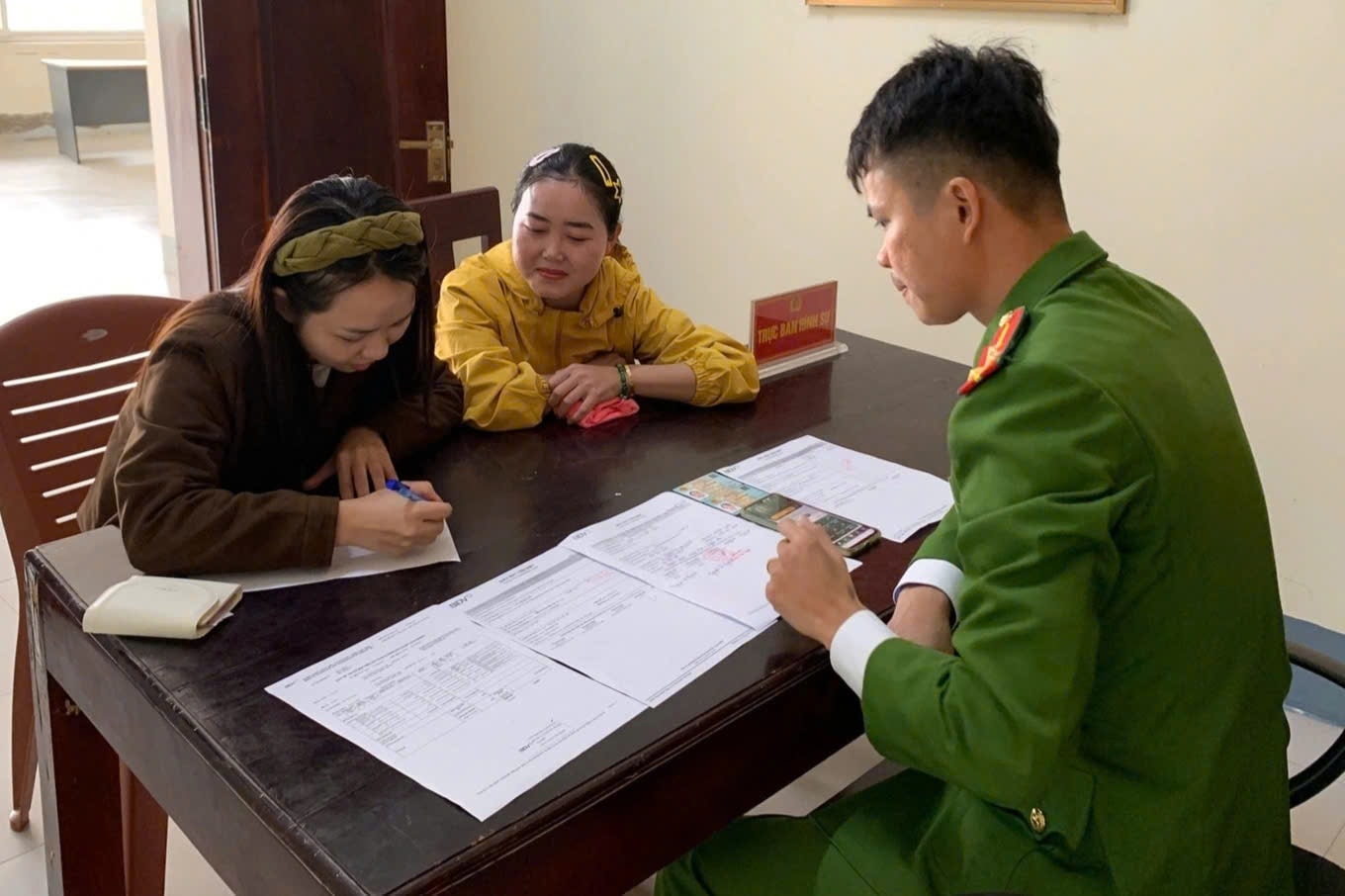 Chị Trần Thị Trang (áo vàng), trú phường Tân Mai, tỉnh Nghệ An đến công an phường Tân Mai để phối hợp hoàn tiền chuyển khoản nhầm. Ảnh: Công an cung cấp.