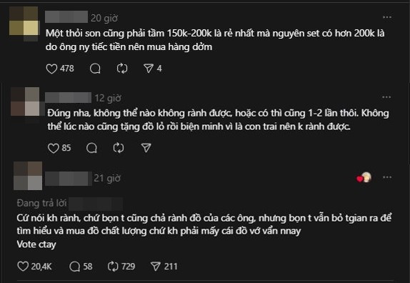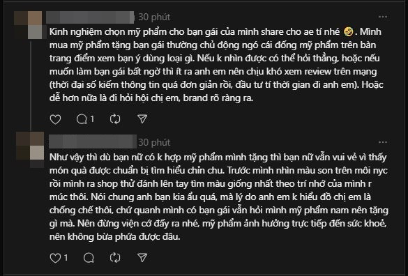 Phần lớn chị em đồng cảm với bạn nữ trong bài đăng, đồng thời bày tỏ quan điểm rằng nếu yêu thật lòng, dù ngân sách hạn chế, vẫn có cách thể hiện sự quan tâm phù hợp. Nhiều bạn nam cũng lên tiếng phản đối thái độ của chàng trai, cho rằng chẳng có gì mất mát nếu dành chút thời gian tìm hiểu, nghiên cứu để tặng quà cho nửa kia đúng đắn và có tính ứng dụng, nhất là những món cá nhân như trang điểm hay chăm sóc da chứ không phải câu chuyện liên quan đến chi phí. Có bạn còn viết ra ghi chú những gì bạn gái thích, để ý những món skincare "tủ" để có thể tặng quà chỉn chu nhất.