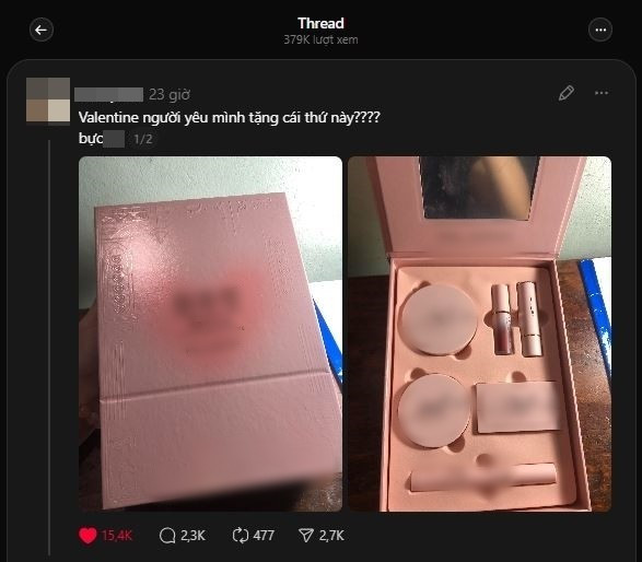 Dịp Valentine vừa qua, câu chuyện về một hộp quà trang điểm trị giá khoảng 250 nghìn đồng đang khiến cộng đồng mạng bàn tán rôm rả. Mọi chuyện bắt đầu khi có 2 bài đăng về quà tặng Valentine được đăng tải lên nền tảng Threads, nhưng nhận phản ứng trái ngược: Một bên thì ủng hộ, khen ngợi còn một bên làm dấy lên sự thất vọng.