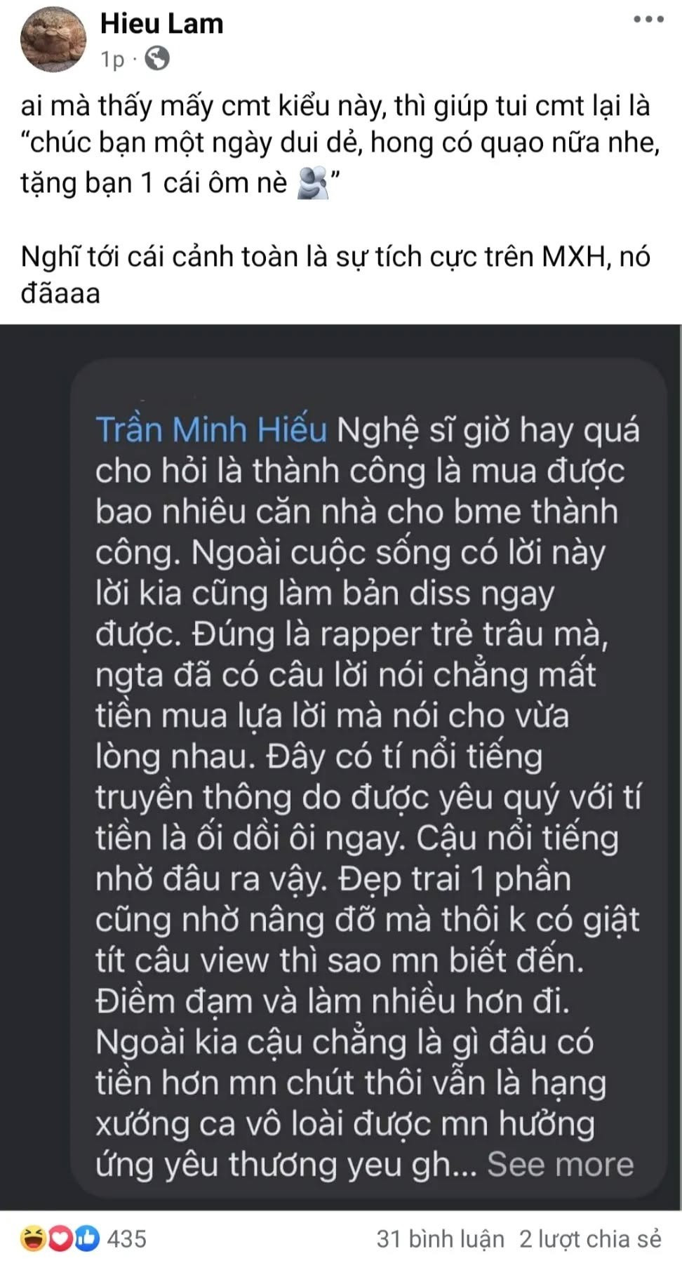 Chẳng hạn như chia sẻ của HIEUTHUHAI về một nhận định của anti-fan được anh chàng đăng trên trang cá nhân của mình. Thay vì cố gắng "mổ xẻ" hay đáp trả, anh kêu gọi mọi người "tặng một cái ôm" cho những ai bình luận tương tự, với mong muốn lan tỏa sự tích cực trên mạng.