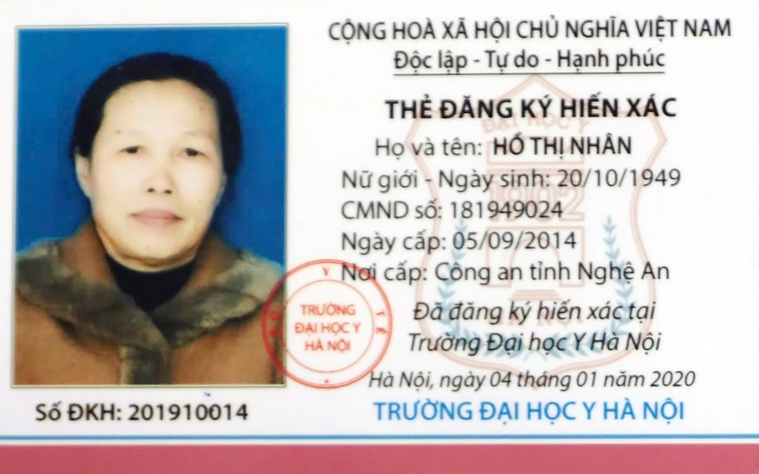 Từ đó đến nay, tấm thẻ công nhận hiến xác được bà Nhân mang theo bên người.