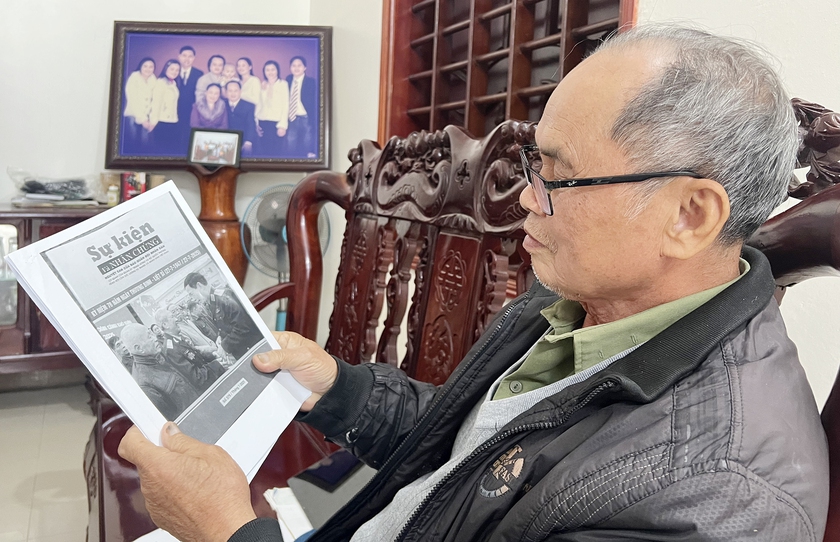 Ông Cao Lãnh Hùng đang xem tư liệu về một bài báo viết về câu chuyện thắp sáng trên cột cờ Hiền Lương. Ảnh: Quốc Huy