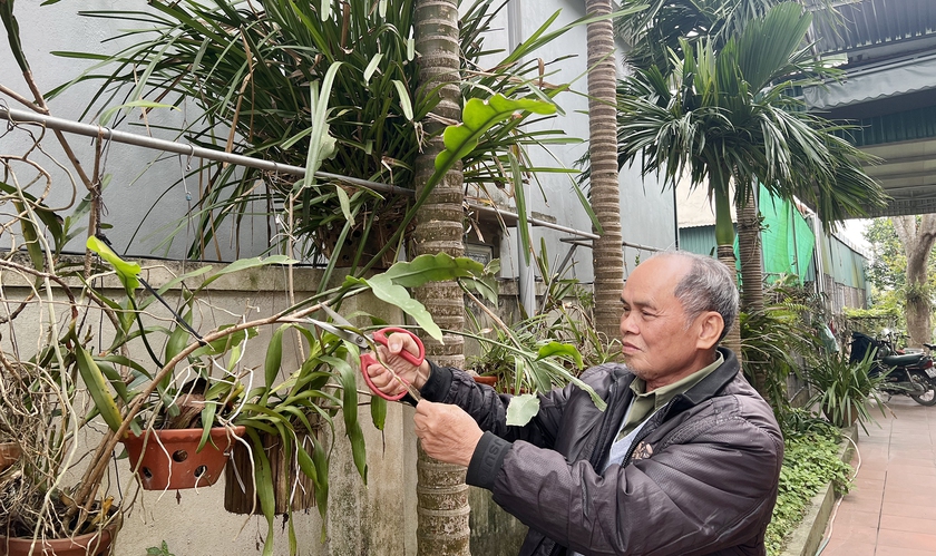 Ông Cao Lãnh Hùng đang chăm sóc cây cảnh ở tuổi xế chiều. Ảnh: Quốc Huy