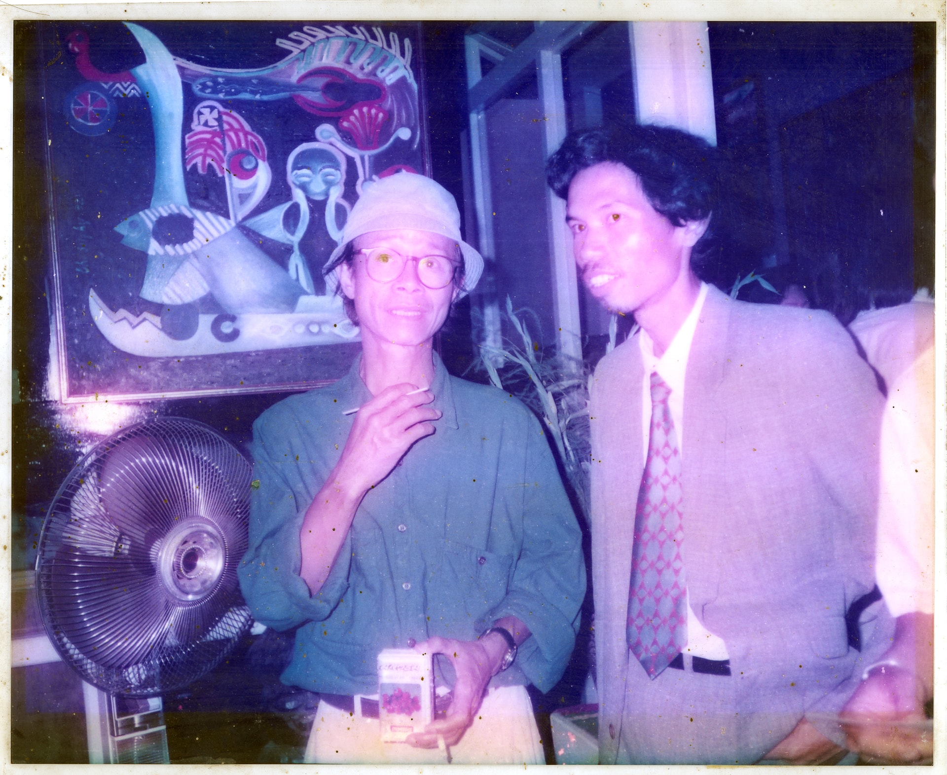Nhạc sĩ Trịnh Công Sơn và tác giả bài viết trong phòng tranh tại triển lãm cá nhân của họa sĩ Nguyễn Thượng Hỷ năm 1992, tại Sài Gòn. Ảnh: N.T.H