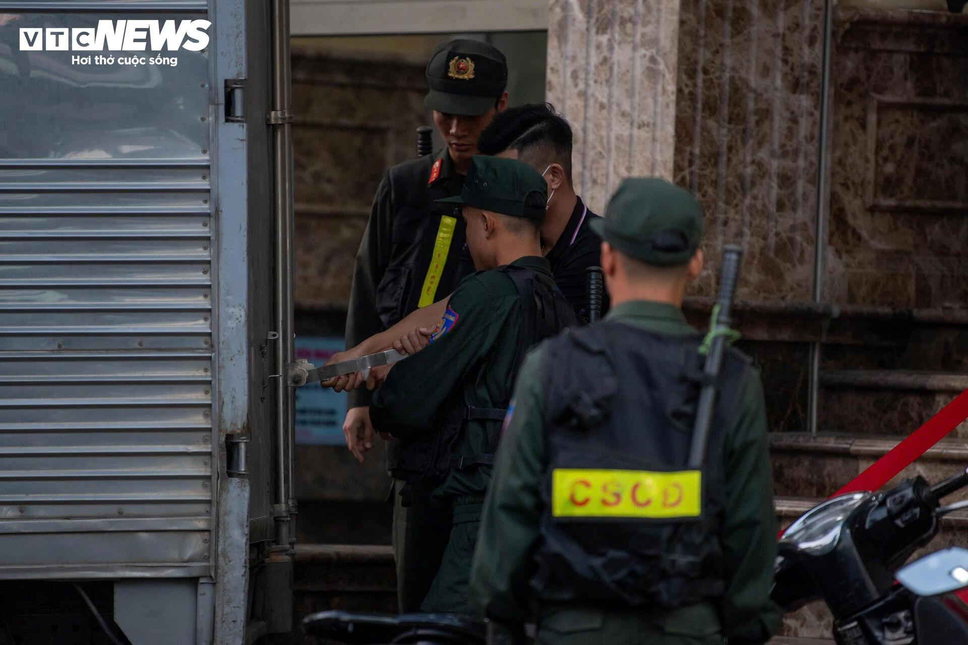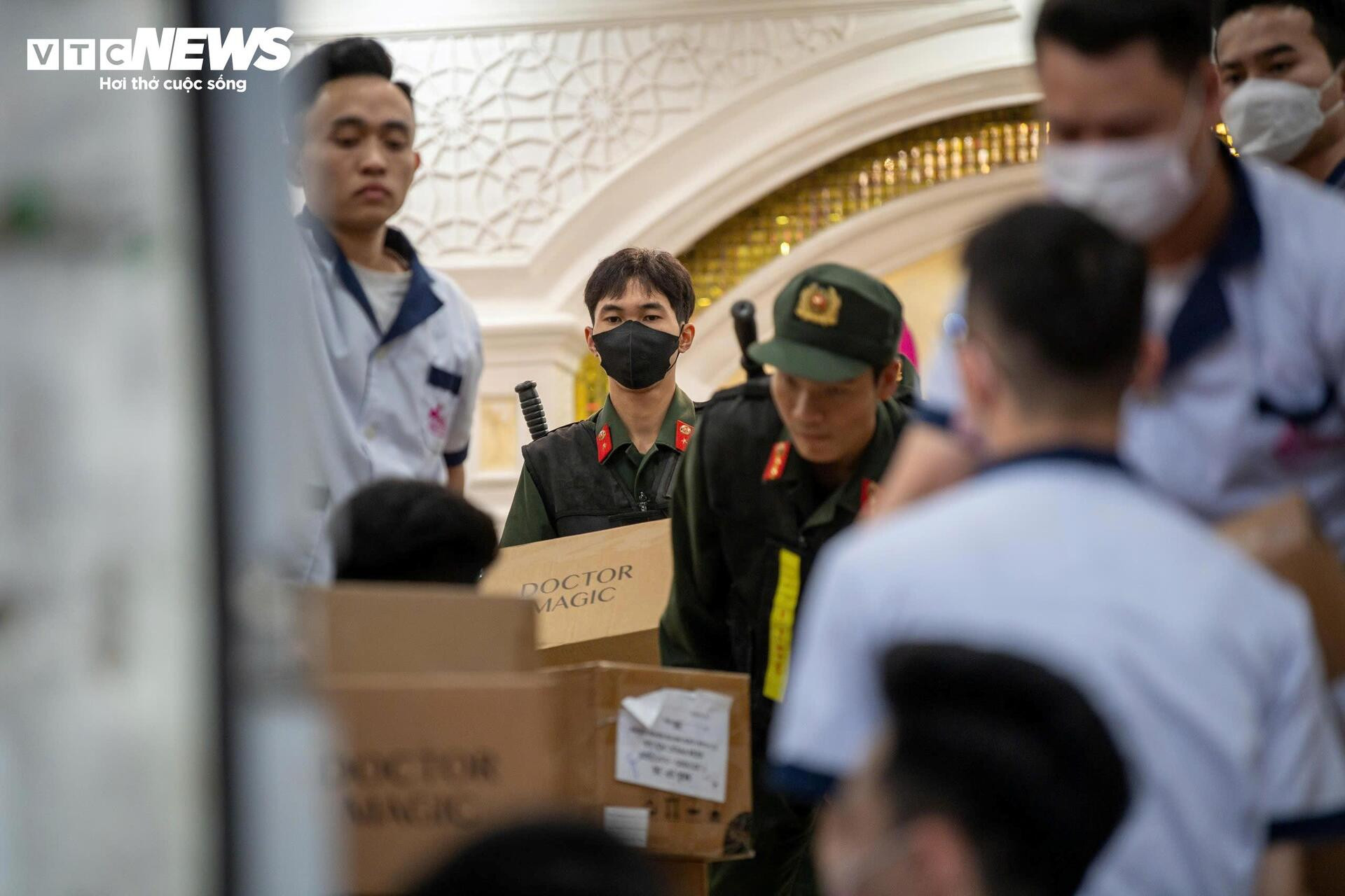 Nhiều thùng carton chứa tài liệu, đồ vật đã được niêm phong được di chuyển ra sảnh trước tòa nhà.