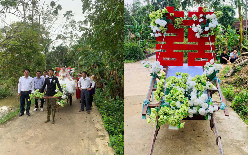 Nhà gái nắm rõ tình hình nên trước đó khoảng 20 phút đã cùng nhau làm chiếc xe hoa đặc biệt từ xe kéo. Mọi người kê ghế làm chỗ ngồi cho cô dâu rồi trang trí hoa xung quanh để xe hoa thêm phần sinh động. Sau đó, với chiếc xe kéo này, một mình chú rể đưa cô dâu qua dòng nước ngập.