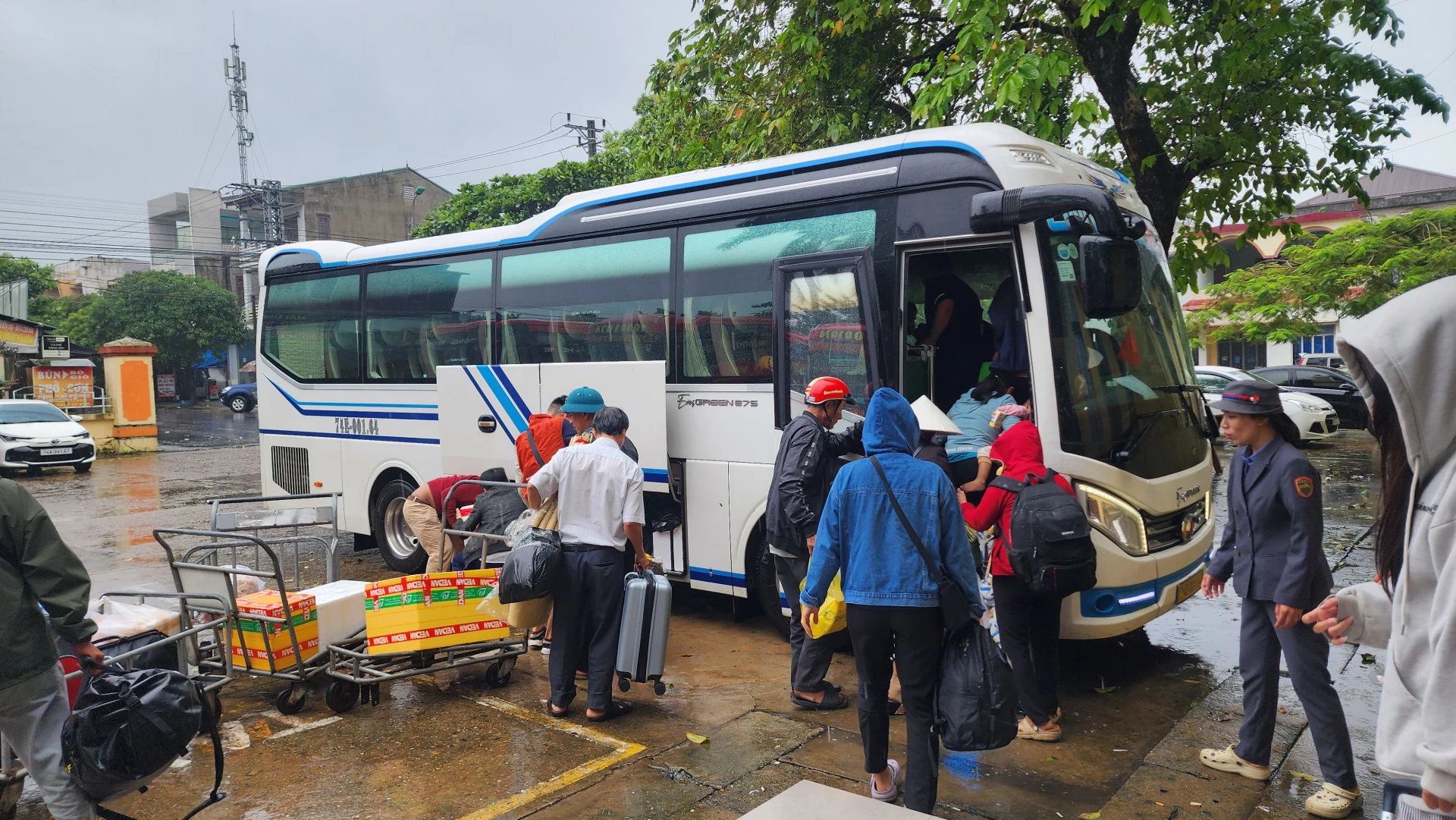 Phương tiện ô tô đã được huy động để tăng bo hành khách đi tàu bị gián đoạn do lũ lụt tại TP. Huế- Ảnh Tạ Hưng