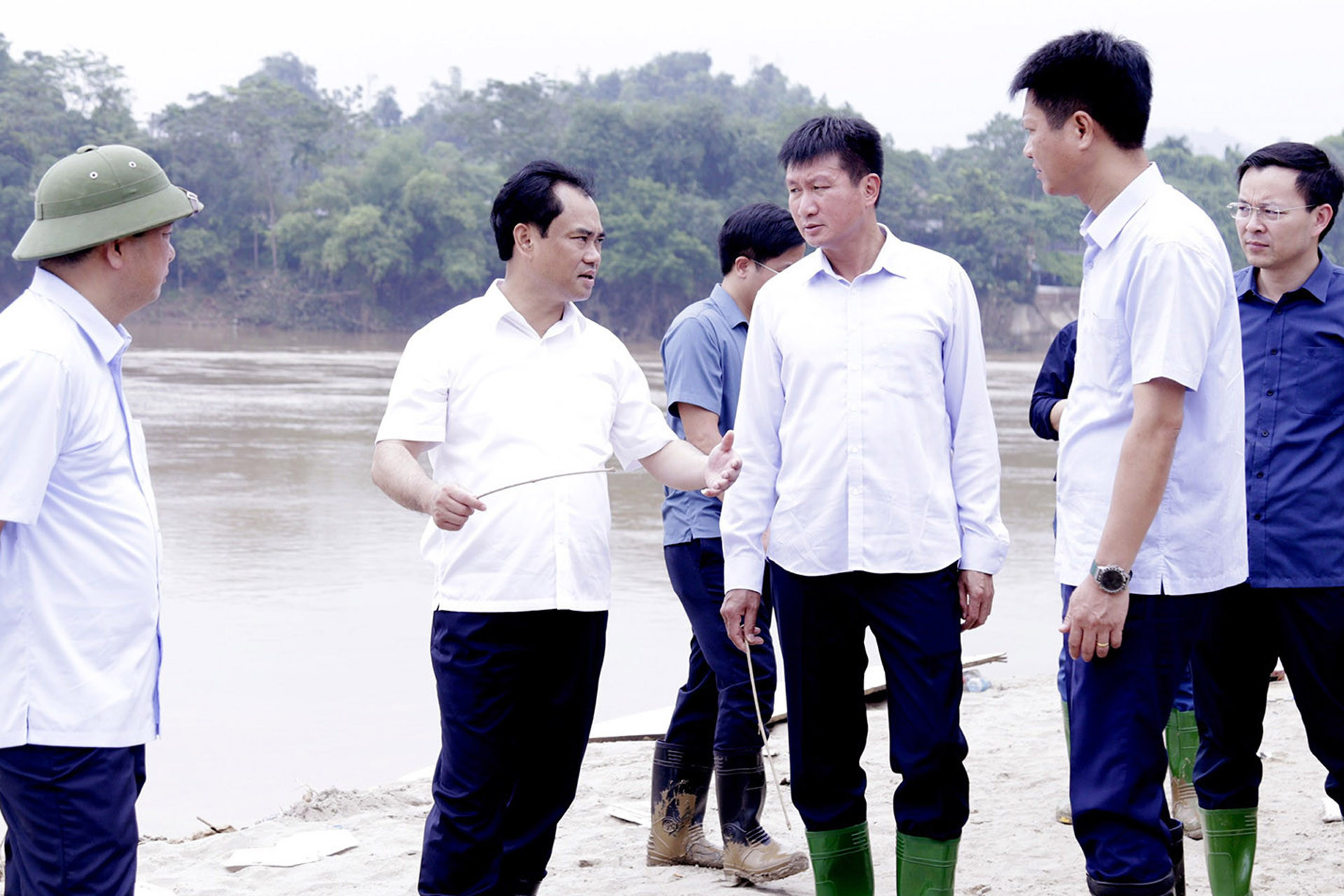 Ông Trịnh Việt Hùng (thứ 2 từ trái sang) kiểm tra thực tế dự án chống ngập ven sông Hồng, tháng 10/2025. Ảnh: Phan Văn Tuấn