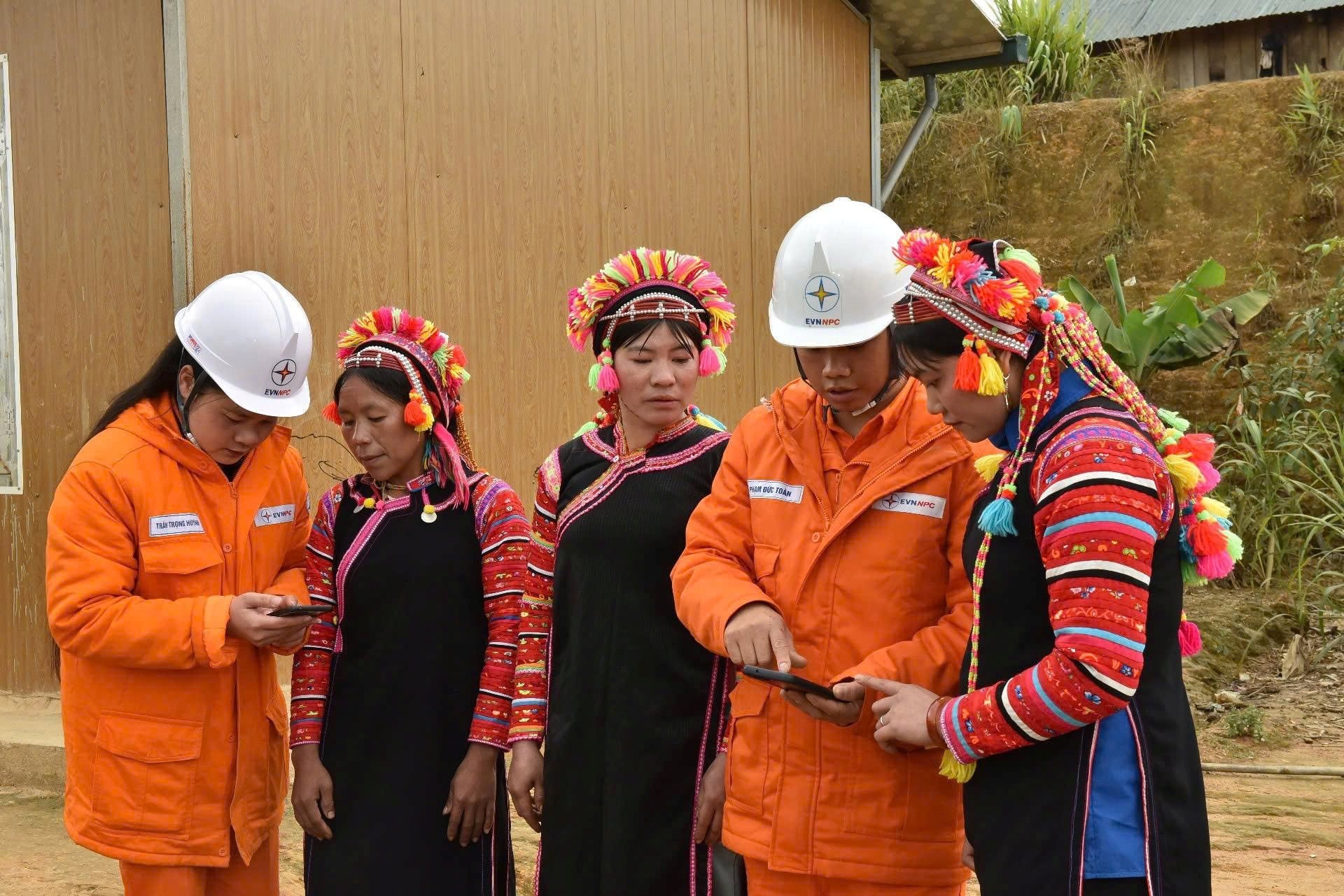 Nhân viên Công ty Điện lực Lai Châu hướng dẫn đồng bào Hà Nhì sử dụng app thanh toán tiền điện trên điện thoại.