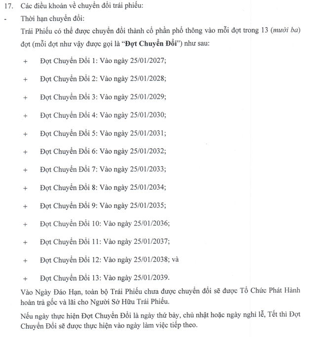 Trái phiếu có tỉ lệ chuyển đổi 1:8, tương đương mỗi trái phiếu có thể chuyển đổi thành 8 cổ phần phổ thông. Giá chuyển đổi dự kiến là 12.500 đồng/cổ phần và được thực hiện theo 13 đợt.