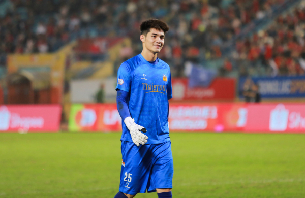 Trái ngược với Văn Hậu, thủ môn Trung Kiên tỏ ra rất vui vẻ sau khi hiệp 1 kết thúc.