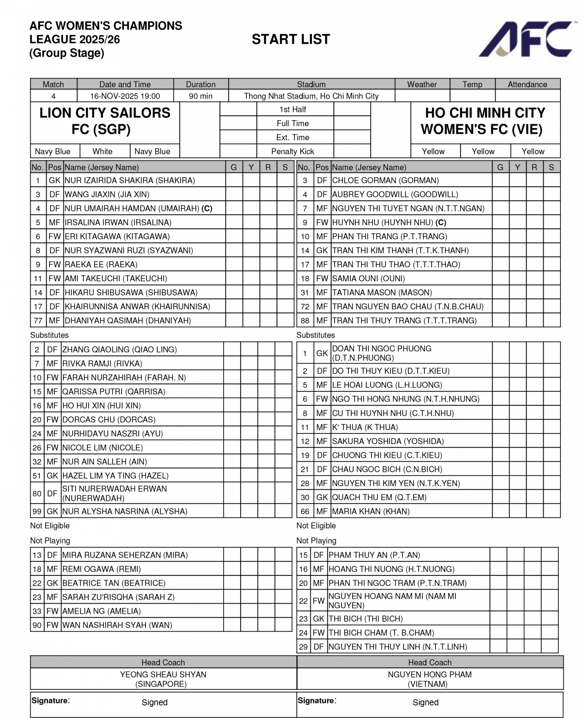 Sau khi vượt qua Stallion Laguna (Philippines) với tỉ số 1-0, CLB nữ TP Hồ Chí Minh bước vào trận đấu thứ hai vòng bảng cúp C1 nữ châu Á 2025/2026 gặp Lion City Sailors (Singapore). Huỳnh Như cùng các đồng đội đặt mục tiêu giành chiến thắng nhằm sớm vượt qua vòng bảng.