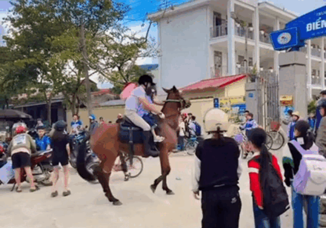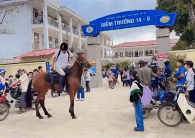 Trong clip, người đàn ông điều khiển chú ngựa tiến vào cổng trường, nơi các học sinh và phụ huynh khác đang tập trung, vừa tạo ra hình ảnh vừa 'độc lạ', vừa khiến không ít người lo lắng về mức độ an toàn.