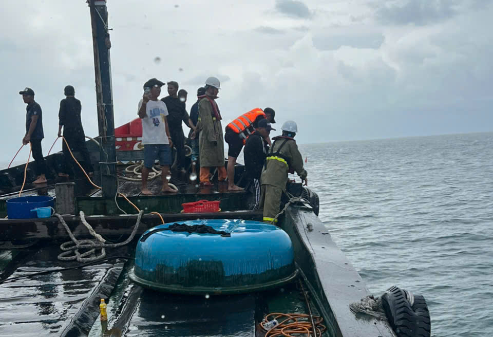 Những thợ lặn cùng lực lượng cứu nạn đang tiến hành khoanh vùng vị trí tàu cá chìm.
