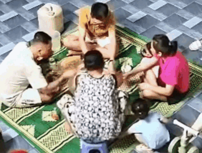 Trong lúc người lớn đang sắp xếp mâm bát, bé gái bất chợt chạy ra phía sau và kéo chiếc ghế mà người bà đang định ngồi xuống. Kết quả, khi bà vừa hạ người, chiếc ghế đã bị rút mất, khiến bà ngã ngửa ra sàn. May mắn là bà không bị thương.