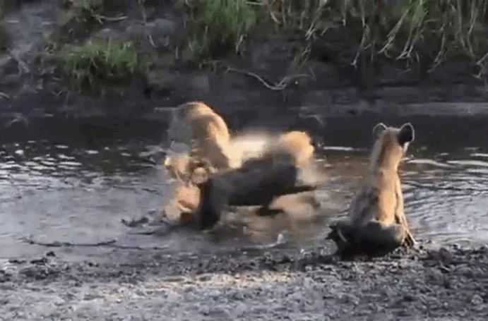 Ban đầu, con linh dương đã thực hiện một pha phòng ngự khó khăn, nhảy xuống hồ nước để trốn thoát. Hành động này tạm thời làm cho bầy linh cẩu gặp khó khăn trong việc săn bắt con mồi. Tuy nhiên, với một món mồi lớn và hấp dẫn như linh dương, đàn linh cẩu không từ bỏ dễ dàng.