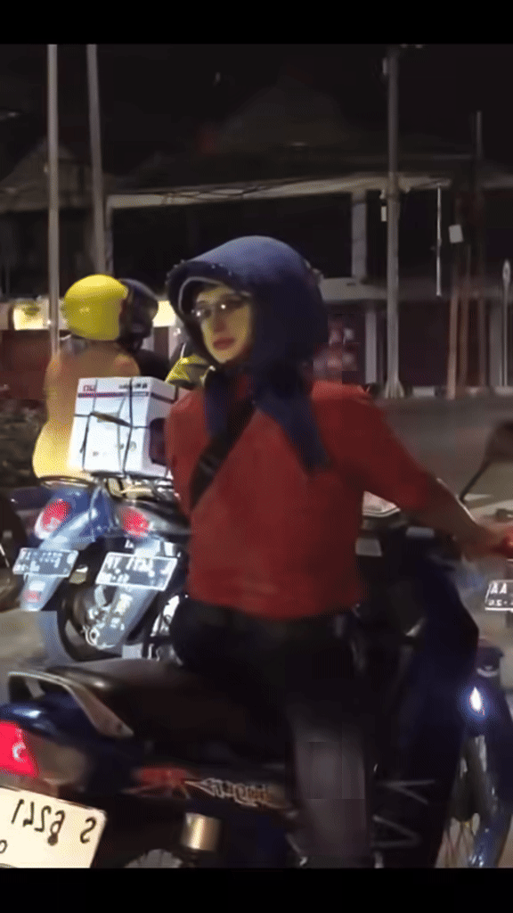 Hóa ra, nguyên nhân khiến anh chàng này trở nên đặc biệt chính là chiếc mũ bảo hiểm mà anh đang đội. Ở phía sau chiếc mũ, phụ kiện được gắn thêm là mặt nạ một cô gái đội khăn, đeo kính trông như thật.