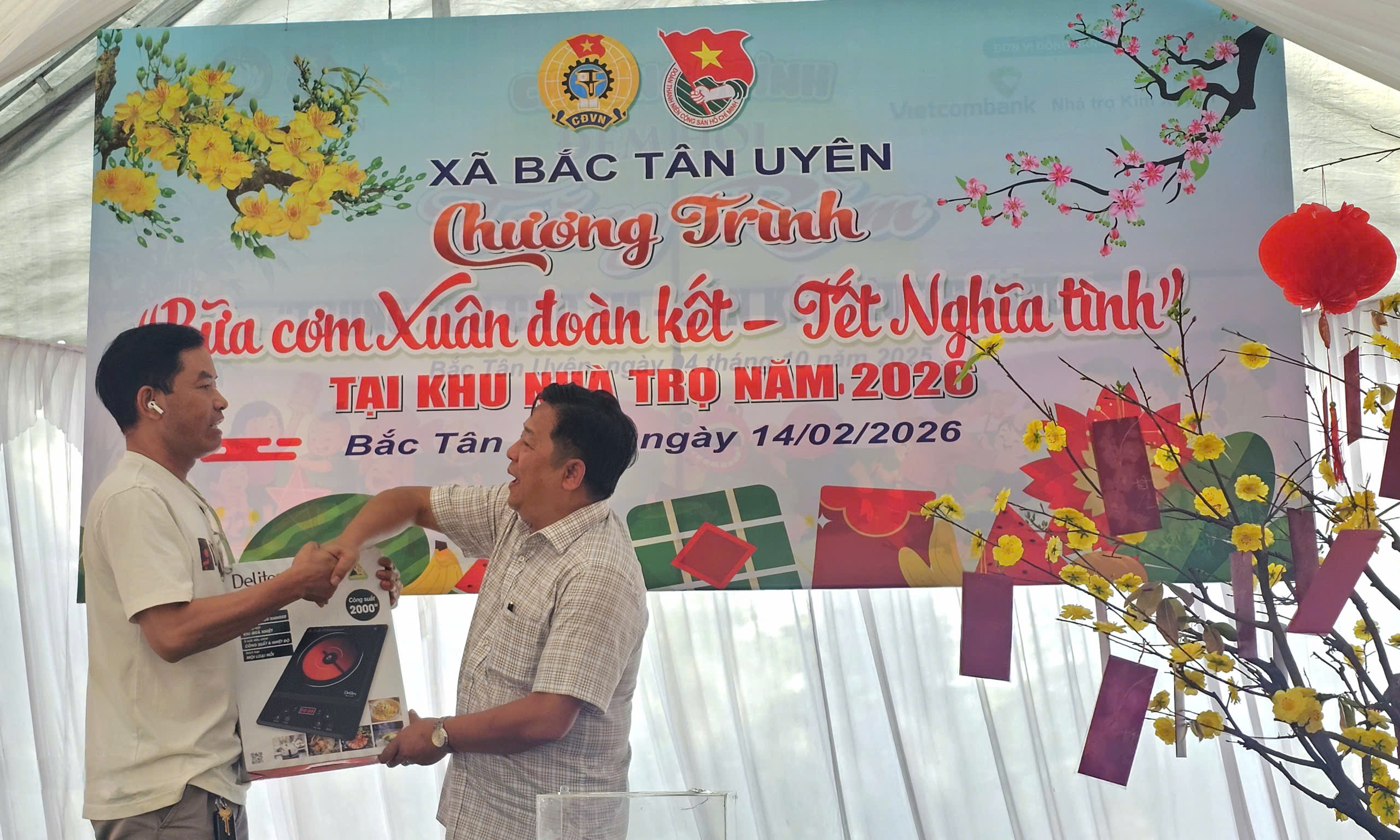 Bữa cơm ngày cuối năm tại khu nhà trọ Kim Xuyến ở xã Bắc Tân Uyên, TPHCM rôm rả hơn khi có thêm phần bốc thăm trúng thưởng, với các phần quà như bếp từ, nồi cơm điện, ấm siêu tốc...