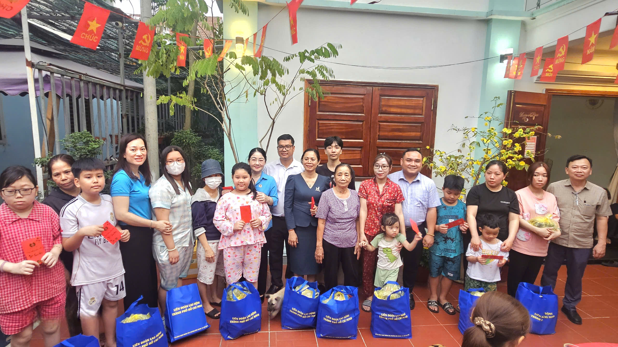 Tại đây, người lao động và các em nhỏ được lãnh đạo LĐLĐ TPHCM, phường Phú Lợi và Hội Xây dựng TPHCM tặng quà, bánh chưng và lì xì