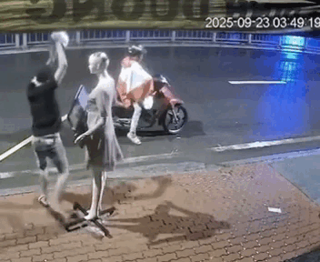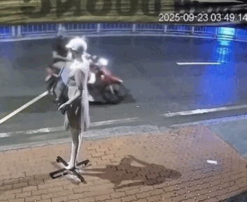 Người thanh niên ngồi sau đã xuống xe, tiến đến, dùng tay tháo thẳng chiếc mũ trên đầu 'người mẫu giả' mà không có bất kỳ sự cho phép nào, đội lên đầu mình rồi nhanh chóng rời đi. Toàn bộ hành động này diễn ra một cách công khai, cho thấy sự coi thường pháp luật và ý thức cộng đồng.