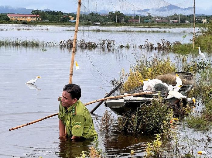 Một kiểm lâm viên lội nước tháo dỡ bẫy lưới trên "tử địa" dành cho cò.