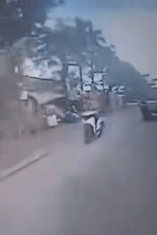 Một người phụ nữ đi xe máy ngang qua đã bị hất văng. Ảnh cắt từ clip/Nguồn: Thơ Mai Văn