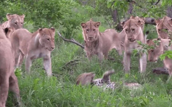 Sau một khoảng thời gian giằng co dữ dội, con báo hoa mai cuối cùng bị đàn sư tử hạ gục. Điều đáng chú ý là sau khi kết liễu đối thủ, cả đàn sư tử rút lui trong im lặng mà không ăn thịt con báo hoa mai.