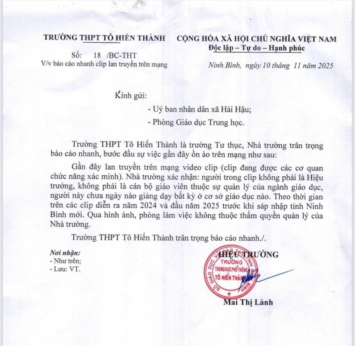 Liên quan đến vụ việc, Trường THPT Tô Hiến Thành - ngôi trường được cho là nơi xảy ra vụ việc – đã phát đi báo cáo nhanh gửi Ủy ban nhân dân xã Hải Hậu và Phòng Giáo dục Trung học (Sở GD&ĐT Ninh Bình). Trong báo cáo, nhà trường khẳng định: "Người trong clip không phải là Hiệu trưởng, không phải là cán bộ, giáo viên thuộc sự quản lý của ngành giáo dục. Người này chưa từng giảng dạy tại bất kỳ cơ sở giáo dục nào. Theo thời gian trên các clip, sự việc diễn ra vào năm 2024 và đầu năm 2025, trước khi sáp nhập tỉnh Ninh Bình mới. Qua hình ảnh, phòng làm việc xuất hiện trong clip không thuộc thẩm quyền quản lý của nhà trường”.