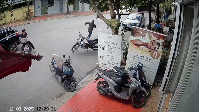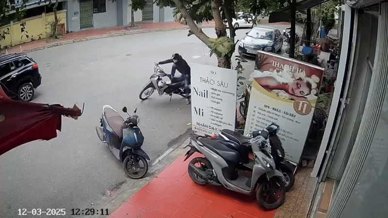 Tiếp đó, một người đàn ông đi xe đạp điện ngang qua, thấy nam thanh niên có biểu hiện bất minh nên dừng lại "hỏi thăm". Nam thanh niên "có tật giật mình" nên lập tức bỏ chạy lên xe đồng bọn đang đứng cảnh giác rồi cả hai tháo chạy. Toàn bộ sự việc đã được camera an ninh ghi lại.