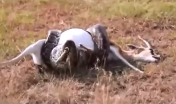 Ngay sau khi tiếp cận và khống chế con mồi, con trăn lập tức siết chặt thân mình quanh linh dương, khiến nó nhanh chóng rơi vào tình trạng ngạt thở.