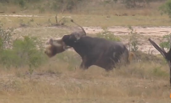 Thế nhưng, chính sự chủ quan và thiếu đề phòng đã khiến chúng phải trả giá. Trong một khoảnh khắc bất cẩn, con trâu rừng bất ngờ vùng dậy, tung cú húc cực mạnh khiến một con sư tử bị hất ngược lên không trung, buộc cả hai phải tháo chạy trong hoảng loạn.