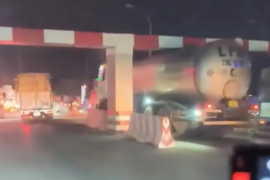 Xe bồn trước khi phát nổ, chạy qua barie.