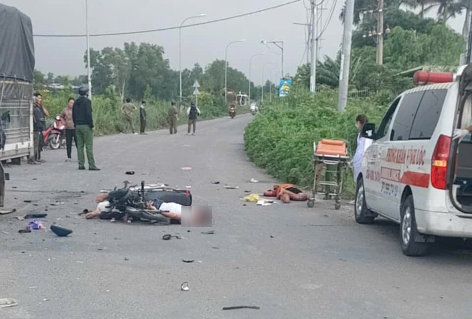 Theo đó, khoảng 13 giờ cùng ngày, xe tải lưu thông trên đường Trần Hải Phụng (xã Tân Vĩnh Lộc), khi đến khúc cua thì va chạm với xe máy chở hai người đi chiều ngược lại.