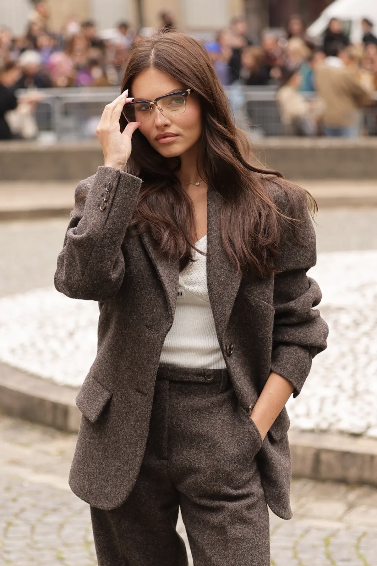 Thylane Blondeau (sinh năm 2001), người từng được mệnh danh là “cô bé đẹp nhất thế giới” khi mới 6 tuổi, thu hút ống kính truyền thông khi xuất hiện tại show Miu Miu trong khuôn khổ Tuần lễ thời trang Paris Xuân/Hè 2026. Người mẫu Pháp tạo dáng trước ống kính bên ngoài Palais d’Iena trong bộ suit dạ nâu, phối cùng áo dệt kim cổ chữ V màu kem và giày cao gót mũi nhọn ton-sur-ton. Gen Z để tóc nâu dài uốn nhẹ, trang điểm tự nhiên và đeo kính mắt, toát lên vẻ thanh lịch, sang trọng.