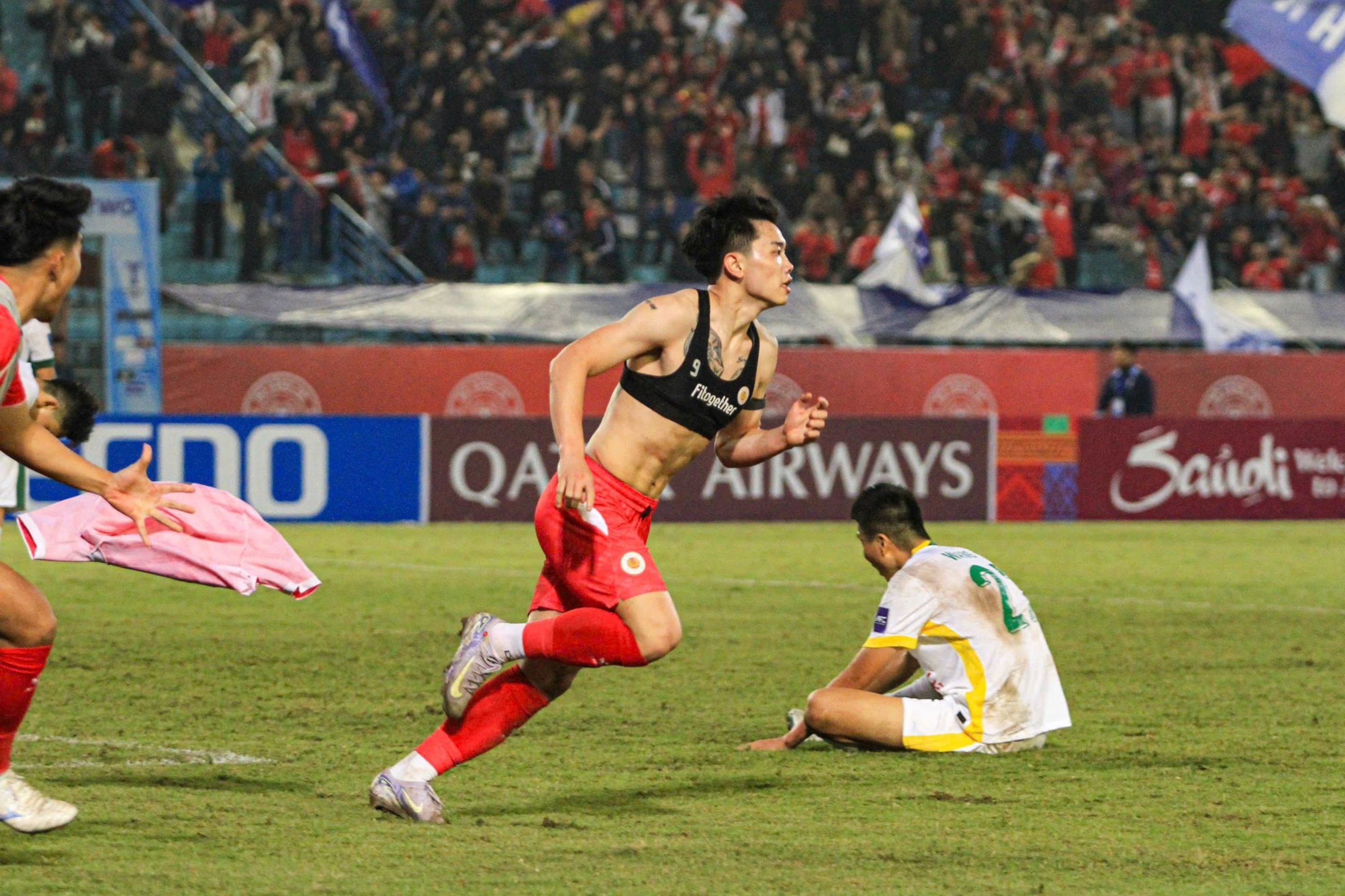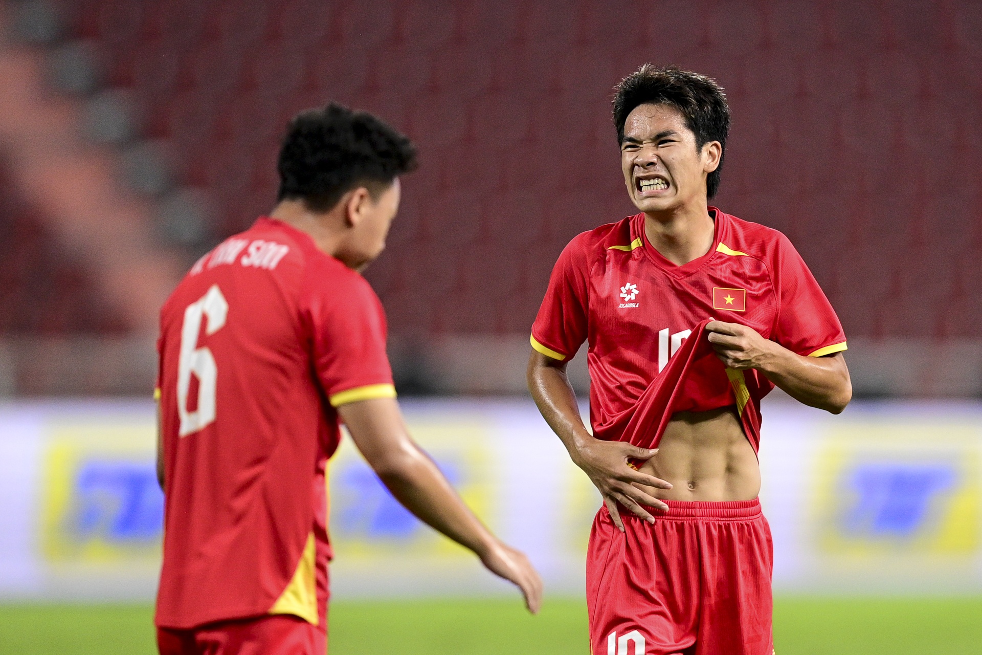 Trong hiệp phụ, tiền đạo Nguyễn Thanh Nhàn trở thành tâm điểm khi tung cú dứt điểm quyết đoán trong vòng cấm ở phút 96, nâng tỷ số lên 3-2 cho U22 Việt Nam. Ngay sau bàn thắng mang tính bước ngoặt, Thanh Nhàn cởi áo ăn mừng, để lộ cơ bụng 6 múi săn chắc. Ảnh: Minh Chiến.