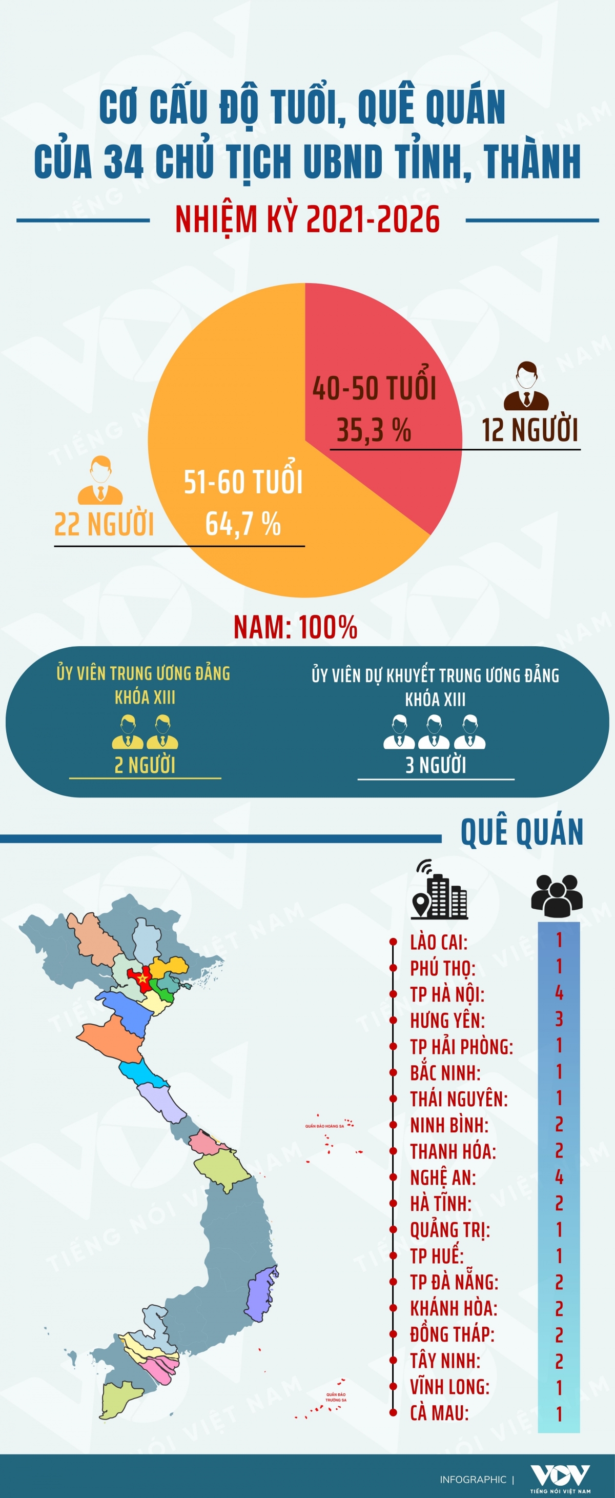 Cơ cấu độ tuổi, quê quán của 34 chủ tịch UBND tỉnh, thành nhiệm kỳ 2021-2026