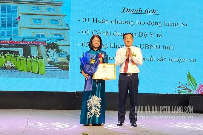 Đại diện tập thể Trung tâm Kiểm nghiệm thuốc, mỹ phẩm, thực phẩm tỉnh nhận giấy khen tại hội nghị biểu dương điển hình tiên tiến ngành y tế giai đoạn 2020-2025