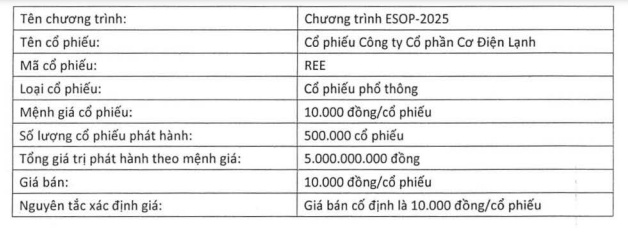 Mục tiêu của đợt phát hành là thúc đẩy hiệu suất làm việc của đội ngũ quản lý chủ chốt của nhóm công ty, đồng thời thúc đẩy sự gắn kết với hiệu quả hoạt động và sự phát triển bền vững lâu dài của REE. Số cổ phiếu ESOP này sẽ bị hạn chế chuyển nhượng trong vòng 3 năm kể từ ngày kết thúc đợt chào bán và giải tỏa dần theo lộ trình.