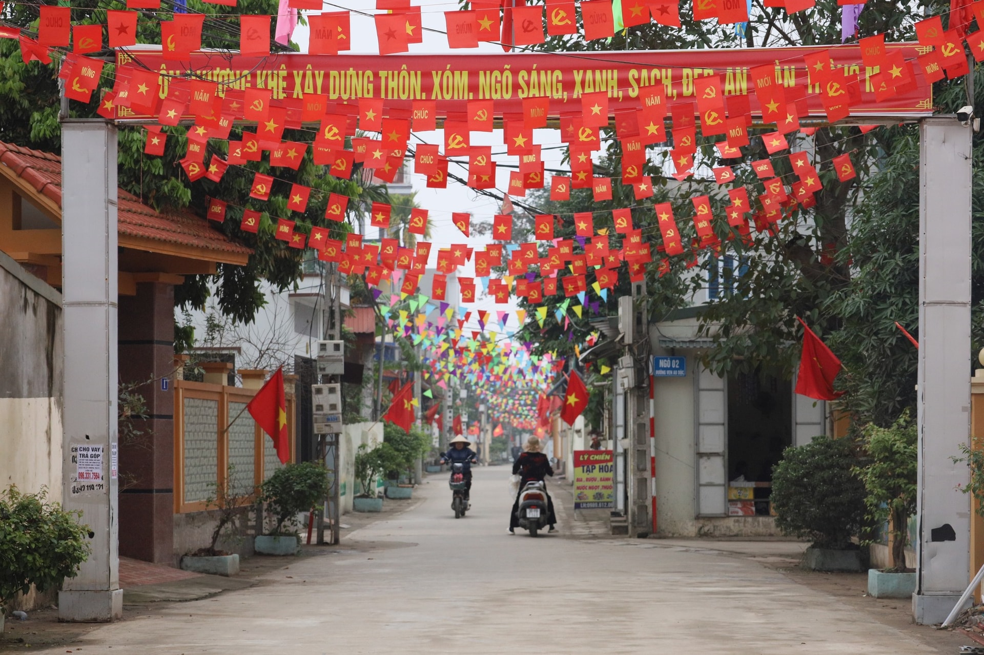 Xã Cổ Đô rực rỡ cờ hoa, sẵn sàng cho ngày hội non sông. Ảnh: Hồng Đạt